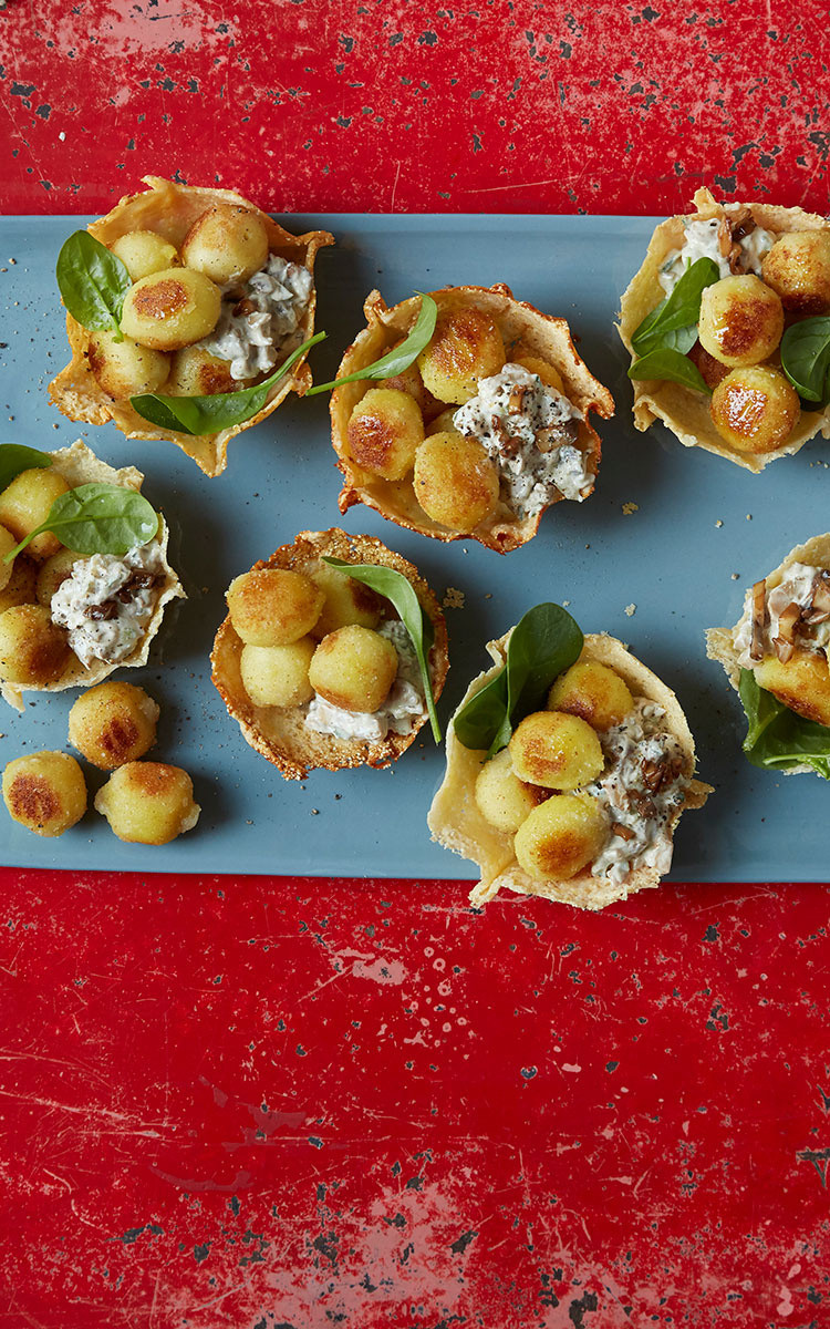 Emplata la mousse de champiñones en las canastas de Parmigiano, añade los gnocchi para dorar y unas cuantas hojas de espincas y sirve.