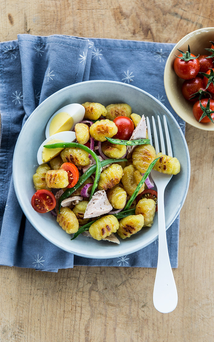 Emplatar los gnocchi, agregar los huevos duros cortados en gajos y servir.
