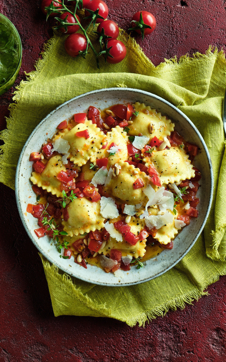 Ravioli de alcachofas y jamón con tomate, Parmigiano Reggiano y piñones tostados