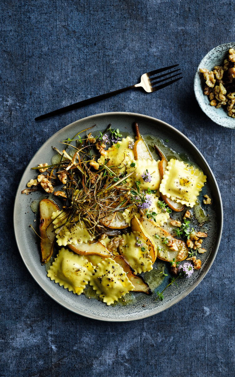 Ravioli de berenjenas rellenas con pera, tomillo, puerro frito, miel y nueces