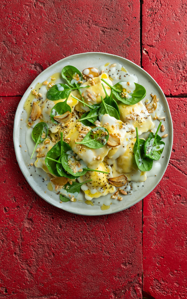 Coloca los raviolis, decora el plato con espinacas frescas y piñones tostados, y termina con un generoso giro de molinillo de pimienta.