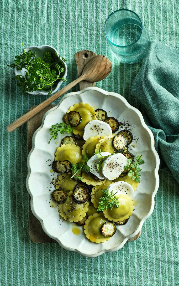 Ravioli jamón y queso con queso de cabra y calabacín a la plancha