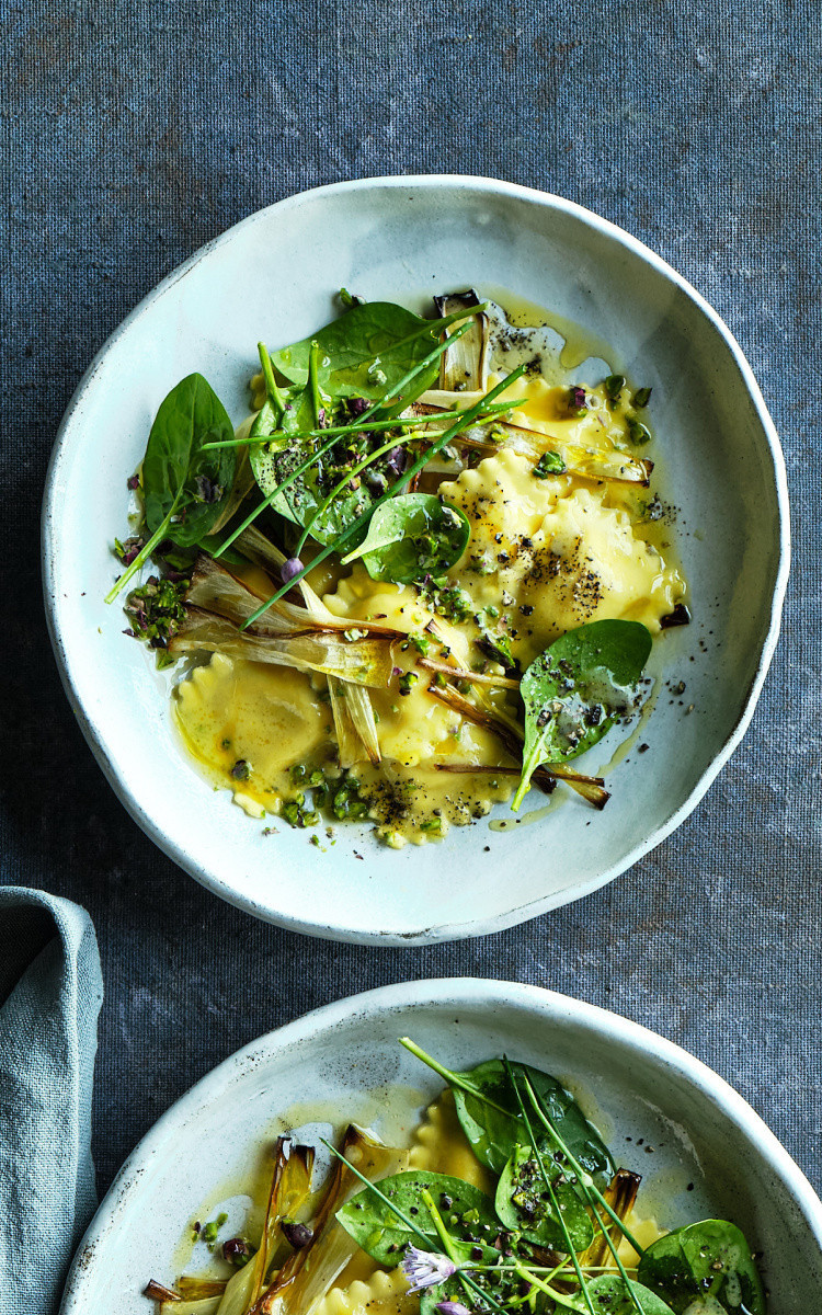 Limpiar el puerro, cortarlo a lo largo en cuartos y asarlo con un chorrito de aceite en el horno hasta que esté ligeramente dorado. hierve los raviolis en abundante agua con sal y cocínalos durante el tiempo de cocción. Al mismo tiempo, en una sartén, derrite la mantequilla con el azafrán y una gota de agua de cocción. Cuando los ravioles estén cocidos, escúrrelos y transfiérelos a la sartén y déjalos aromatizar. Sirve los raviolis con hojas frescas de espinaca, un generoso puñado de pimiento y pistachos picados.