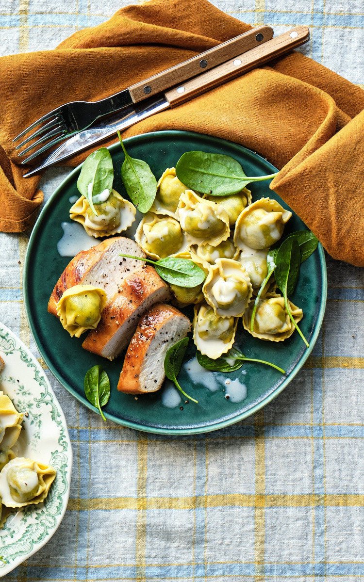 Tortelloni de parmigiano reggiano con pollo y espinacas